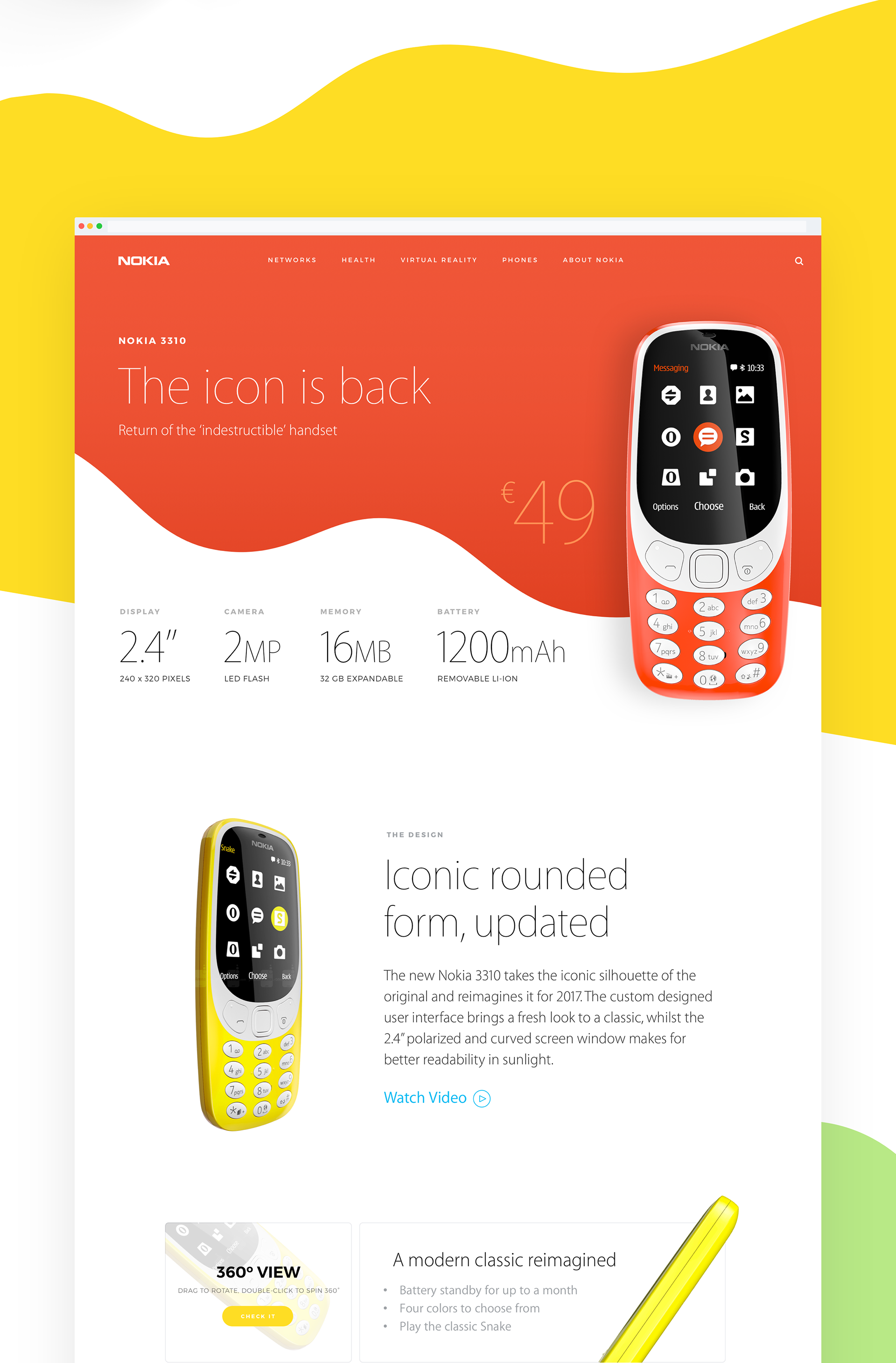To give the new Nokia 3310 the promotion it deserves, Behance user Abhisek Das has created an Apple-themed concept landing page for the new phones. Complete with cartoony waves of colour and dynamic photographs of the products themselves, this concept adds a vibrant design twist that brings back memories of that other turn of the millennium design favourite: the iMac.