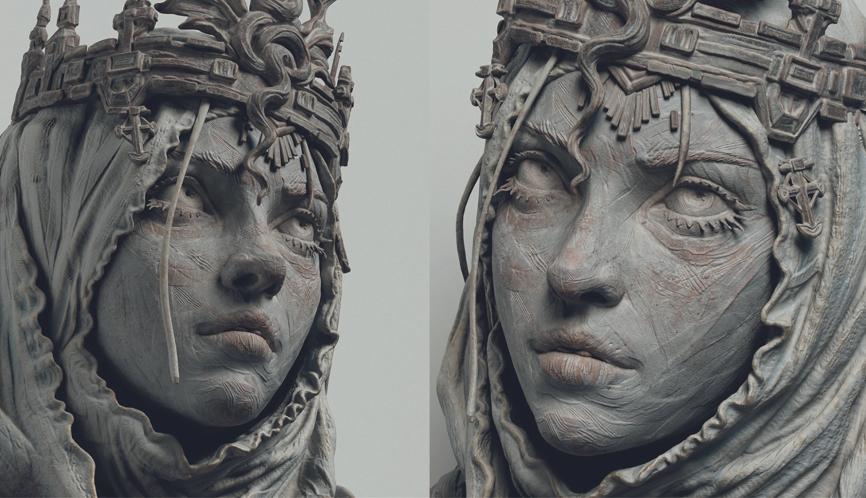After that, I decimate the model to create a low-poly version, then generate automatic UVs in Rizom. Now I have both a high-poly and low-poly mesh, ready for baking in Substance and starting the texturing process. While texturing, I focused on maintaining the rough-sculpture feel and experimented with combining cold and warm tones, using mostly cold tones in the cavities.