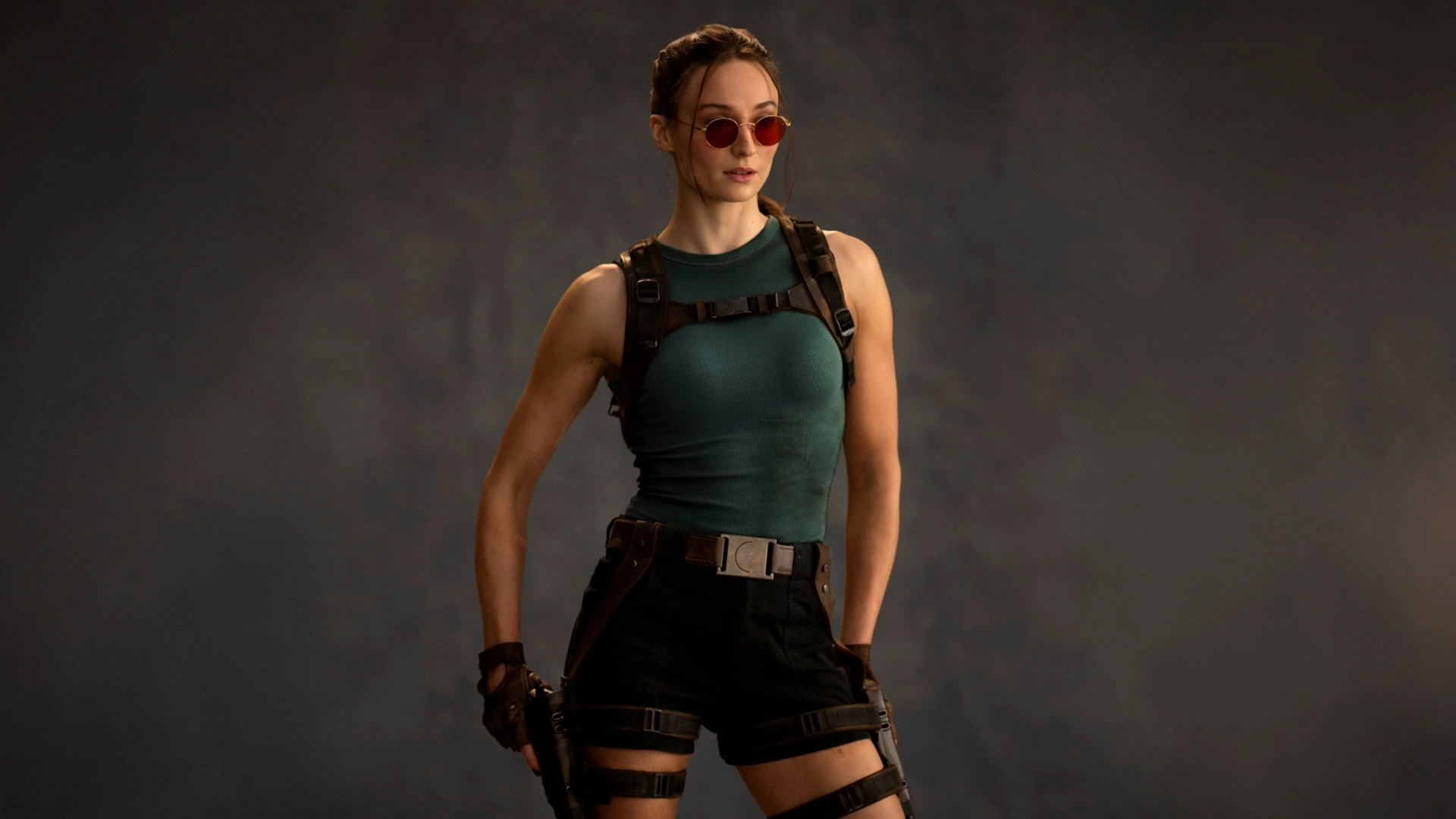 Played by Sophie Turner (of Game of Thrones fame), Tomb Raider's newest Lara Croft sports all the typical makings of the character, including her blue tank top and shorts combo, dark auburn hair and thigh gun holsters. Face-framing strands of hair act as a subtle nod to Angelina Jolie's 2001 depiction, while her iconic red circular shades complete the look.