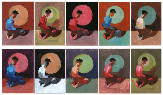 I approach colour by thinking of the colour wheel and how various colours appear in relation to one another. I usually make between four and 10 very quick colour thumbnails, about three inches in height to understand the different colour combinations. Then I choose either the best one or a combination of two for the painting.
