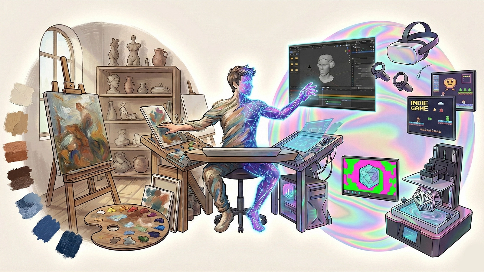 2D artists are discovering new creative opportunities as they experiment with new tools. Many artists find that 3D is a gateway that leads them into other formats and techniques. Some find a desire to experiment with placing their work into AR or VR settings, or even to make their 3D creations into real-world objects. There are accessible VR apps for sculpting like Gravity Sketch and Shapelab Lite, which feel like creating in a physical space. You don't need a costy VR headset either, these work on the best VR headsets like Meta Quest 3s.