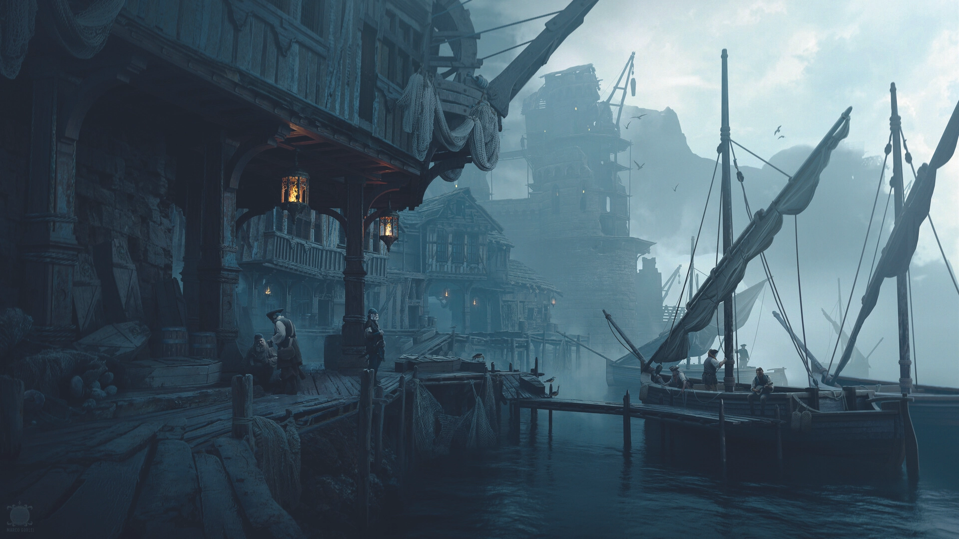 I had the idea of a smuggler’s cove that felt moody, dark and in shambles. I initially established the composition with rock formations, but I scrapped that to make the port the focus.