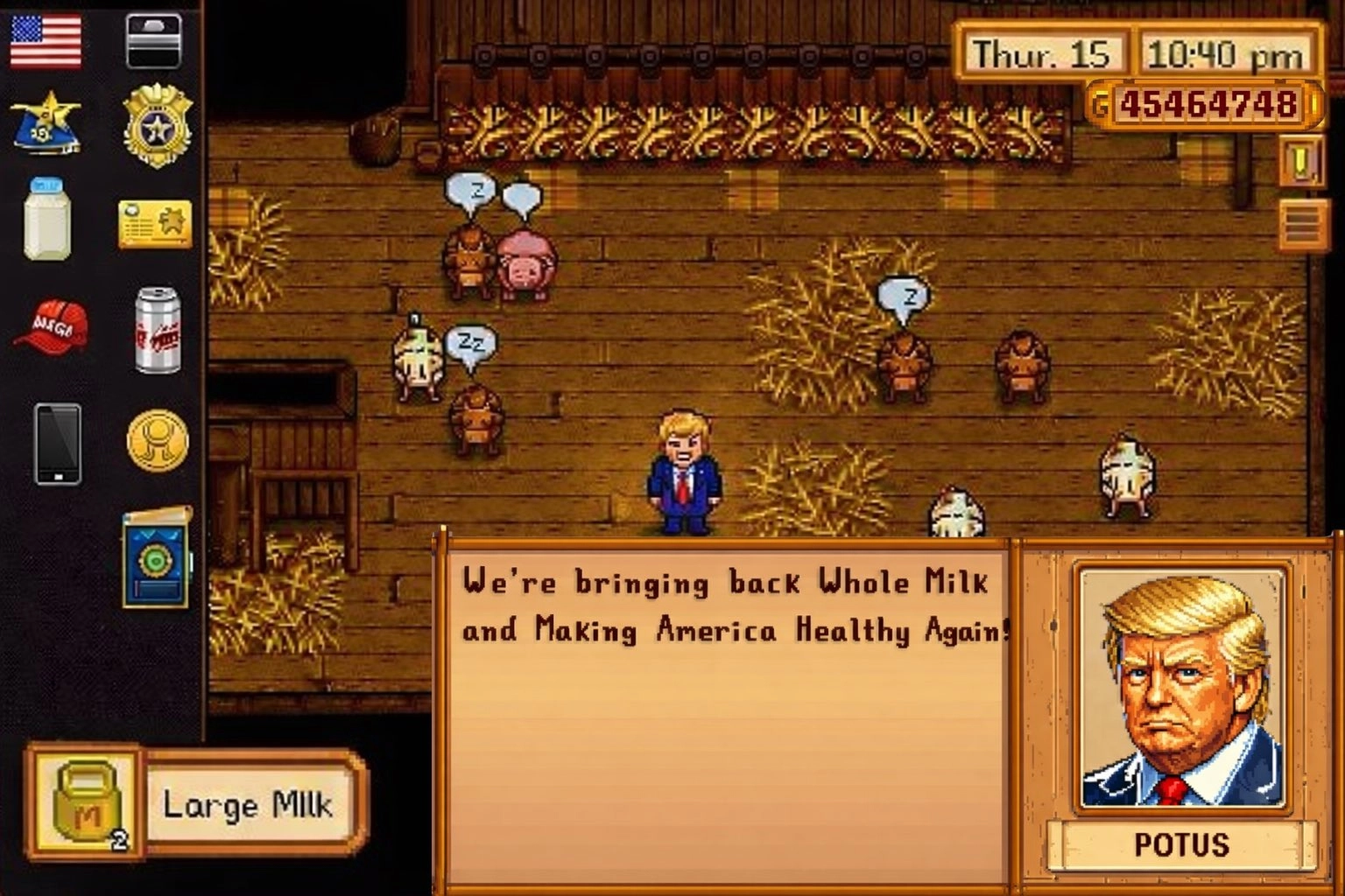 The image, designed to resemble Stardew Valley, appeared on an official White House account to mark the signing of a bill that restores whole and 2% milk to US school lunches. At first glance, it looks like it’s wandered in from a cosy farming game: chunky pixels, a game-style interface, and a squat little character unmistakably meant to resemble Donald Trump.