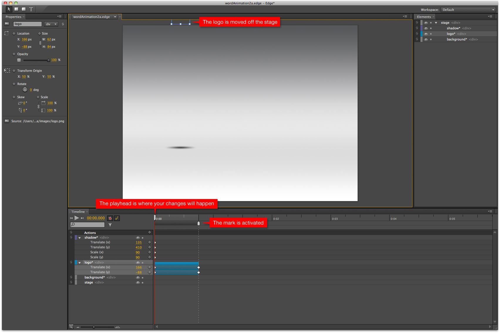 With our logo and shadow in place, we’ll create the transition that brings them onto the stage. We’ll use the aforementioned “mark” to do this. The mark is the gray upward-pointing marker just below the playhead. Before activation, the mark is attached to the playhead, and moves with it with no effect on the timeline. Once activated, by choosing Toggle Mark from the Timeline menu at the top of the screen or by hitting command-K on the Mac, the mark turns white like the playhead. (The same menu item or macro will de-activate the mark as well.) Now as you drag the playhead forward or backward along the timeline, the mark stays pinned in place. The key to using the mark to create a transition is to remember that the timeline will record all attribute changes that happen to your asset, and set keyframes that define those changes, where the playhead is positioned. Wherever the mark is, the asset attributes remain unchanged and keyframes are automatically set. Edge automatically creates an animated tween for each attribute between those two sets of keyframes. Let’s move our logo asset so we can see how this works.