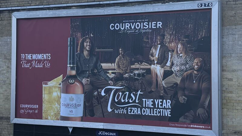Text says 'Toast the year with Ezra Collective' and then there's a second tagline that says 'To the moments that make us'. The logo also appears twice, as well as on the bottle and there's a random mention of ginger ale in there that's very easy to miss. I doubt that this offering will make it on to our best billboards list.