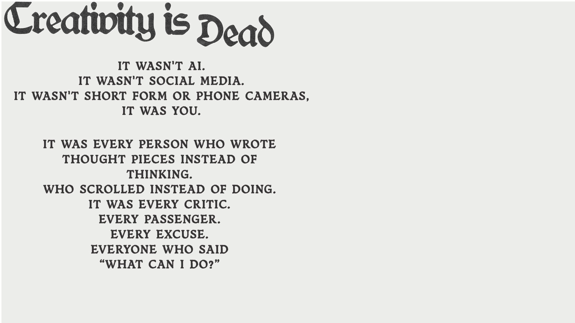 Everyone who scrolls instead of does is complicit. Everyone who writes thought pieces instead of thinking is part of the problem. The threat isn't a lack of ideas but a lack of action.