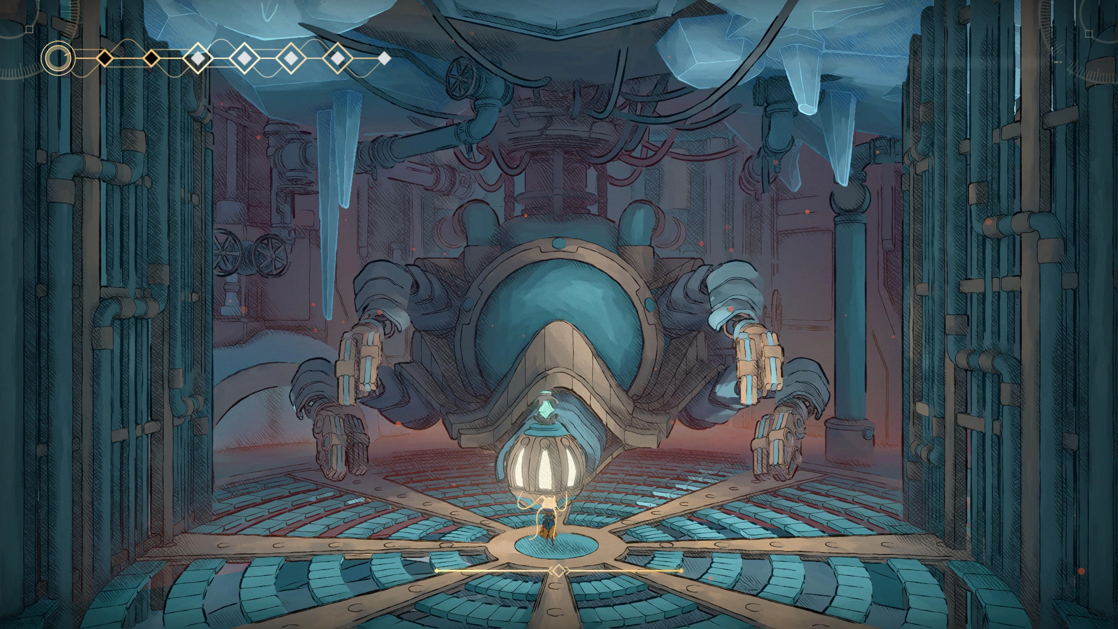 Underneath this visual design, though, lies a very traditional Metroidvania rhythm: explore, fight, iterate, improve. Small, lost droids pepper your journey, offering bits of story, gear, or simply a reason to poke around an off-path cavern. Gear and new abilities let you zip, grapple, climb walls, and better survive environmental hazards. It’s all comfortable territory, but it’s executed with polish and the occasional unexpected twist that will make you smile, whether it's a vast illustrated sleepy machine or a small unassuming snowman that shakes loose its snow to reveal a new boss mech.
