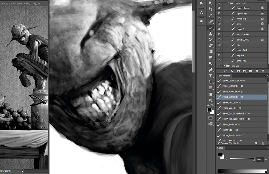 I redraw all the body sections as solid black silhouettes, or sils. Then I repose them quickly and free-transform to distort them toward insect-like proportions, while maintaining familiar human shapes. Then I refine the sils to create fully detailed edges. I usually start an object with silhouettes, then draw lighter values over the black to create surface form and texture.