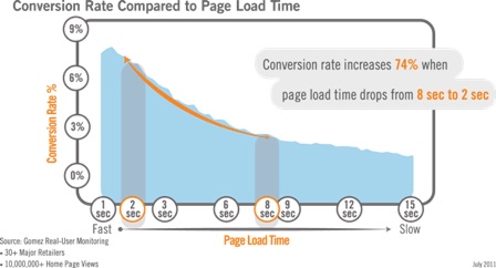 Compuware recently conducted a study of the impact of performance on conversions, tallying over three million page views for 33 retailers. The results: if your page load time is eight seconds and you can improve it to two seconds, your conversion rate increases by 74 per cent.