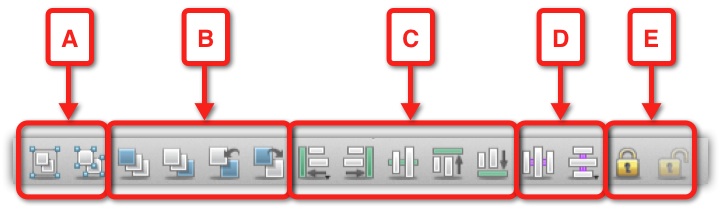 In order to organise widgets on a page, use the tools in the Object toolbar. The following screenshot shows the tools on the Mac version; the identical tools are on the Windows version: