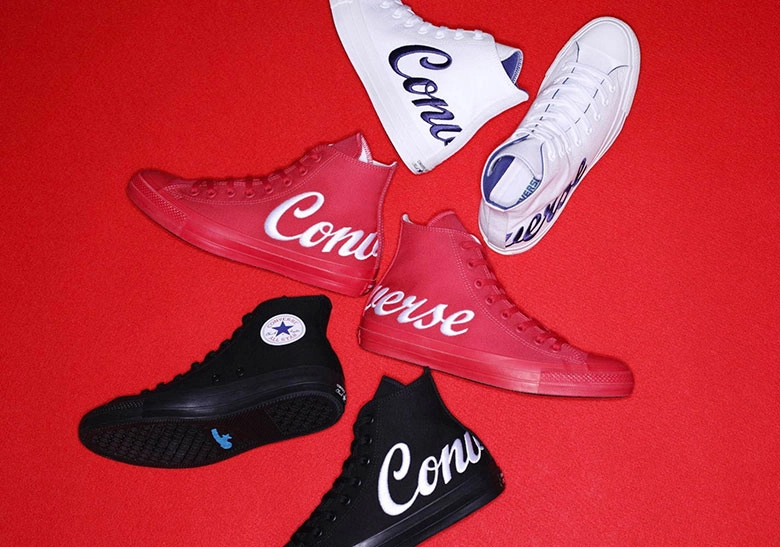As reported by Sneaker News, the latest addition to the massive Converse range is a set of stunning hi-tops that don't just feature the iconic Converse logo design, but also have the Converse name embroidered across both boots in an enormous script font, reminiscent of the Coca-Cola logo. The left boot has 'Conv' written along the side, while the right boot has 'verse' on it.