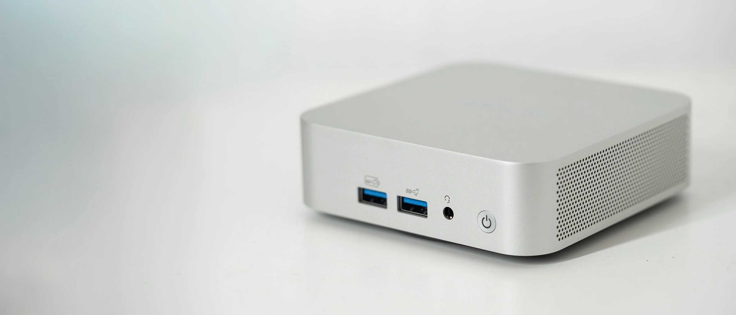 The A5 Pro is a tiny silver puck with rounded corners, looking very much like a Mac Mini that’s been through the wash at too high a temperature with its silvery finish. The Geekom logo is picked out in blue on top, and the power button is easy to access. It has fewer USB ports along the front than the A9 Max, but there are enough studded around its casing for most peripheral loads.