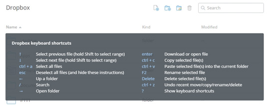The problem with keyboard shortcuts however is that not everyone can remember them. Gmail solves this by showing a glossary when the user presses Ctrl+?; Dropbox does the same except with Ctrl+/, while Asana shows essential combinations across the bottom of the screen.